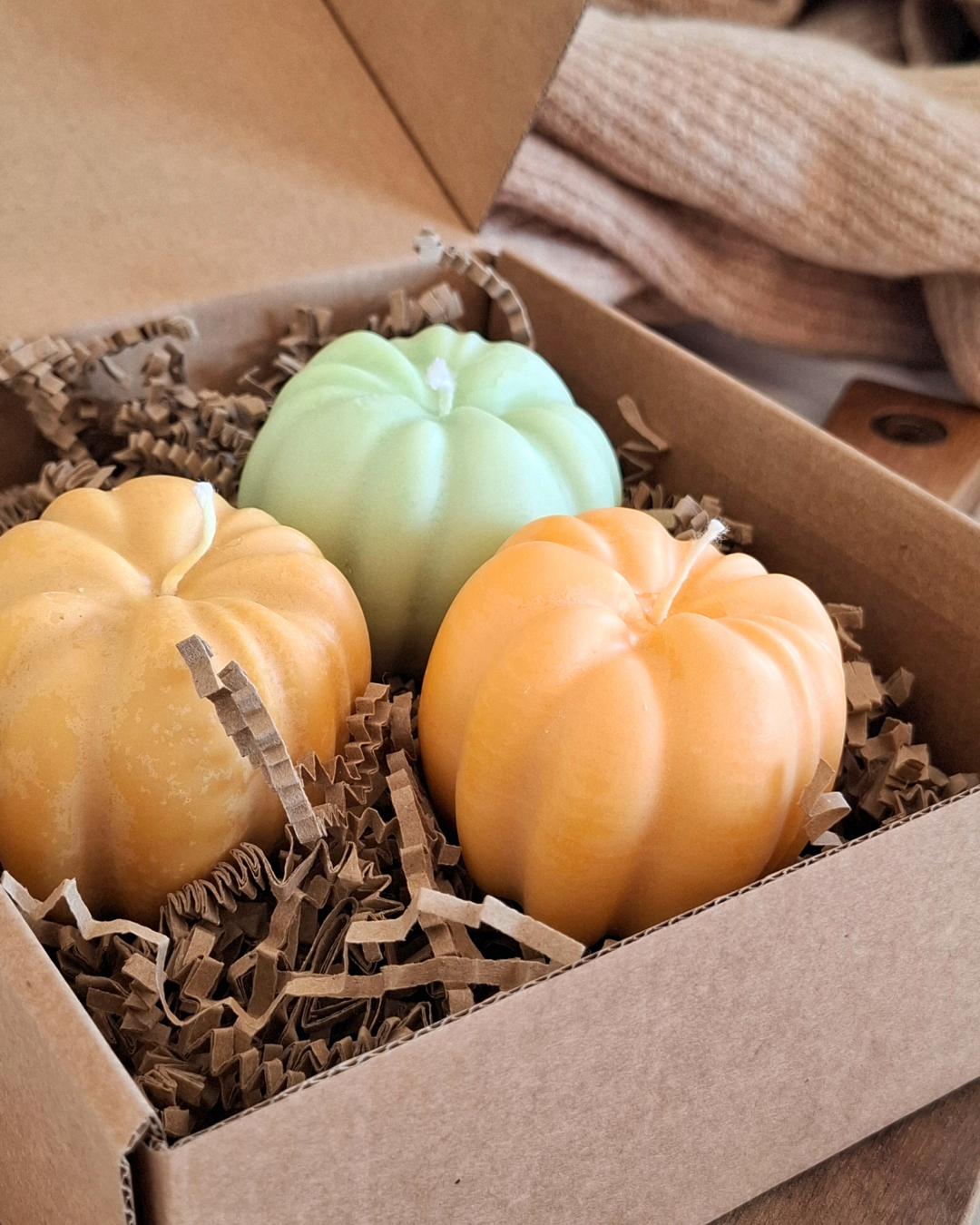 - 3 abóboras em cera de soja, nas cores verde, amarelo e laranja