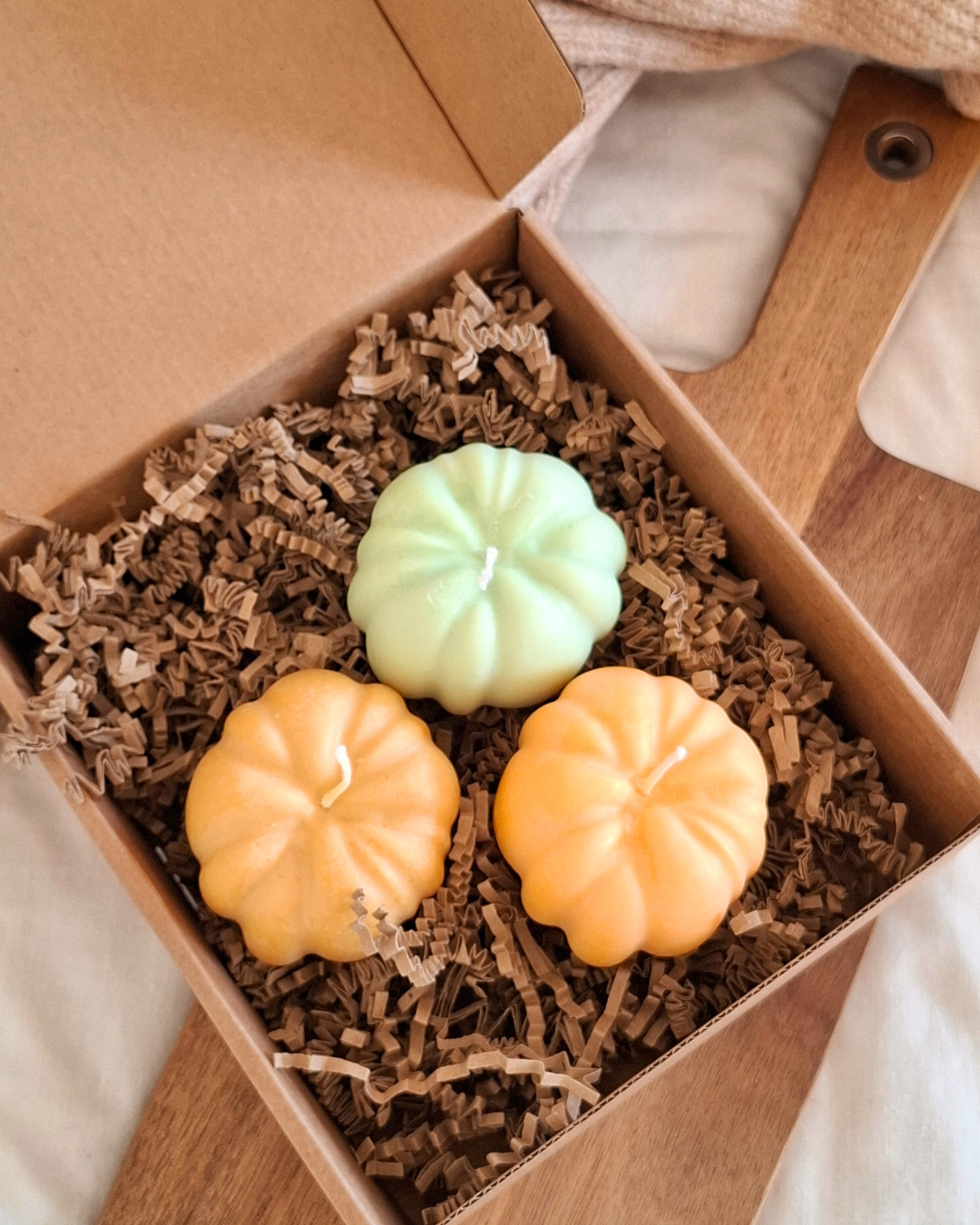 Deixa o encanto do outono espalhar-se pelo teu espaço com este trio de abóboras em cera. Cada cor traz a doçura do aroma a abóbora, caramelo e baunilha, envolvendo a divisão num abraço acolhedor e cheio de alma. Um toque perfeito para transformar qualquer canto num refúgio de conforto.